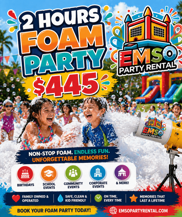 A fun, fully staffed 2 hour foam party rental that turns any event into an exciting, high-energy experience. This rental is designed to bring the foam-filled fun to your celebration while keeping the setup and operation handled for you by trained staff. It is a great choice for birthdays, school events, summer parties, church gatherings, community celebrations, and other special occasions where you want something lively, memorable, and easy to enjoy. With the foam party fully managed for the duration of the rental, you can focus on your guests and enjoy the excitement without the stress of running it yourself.